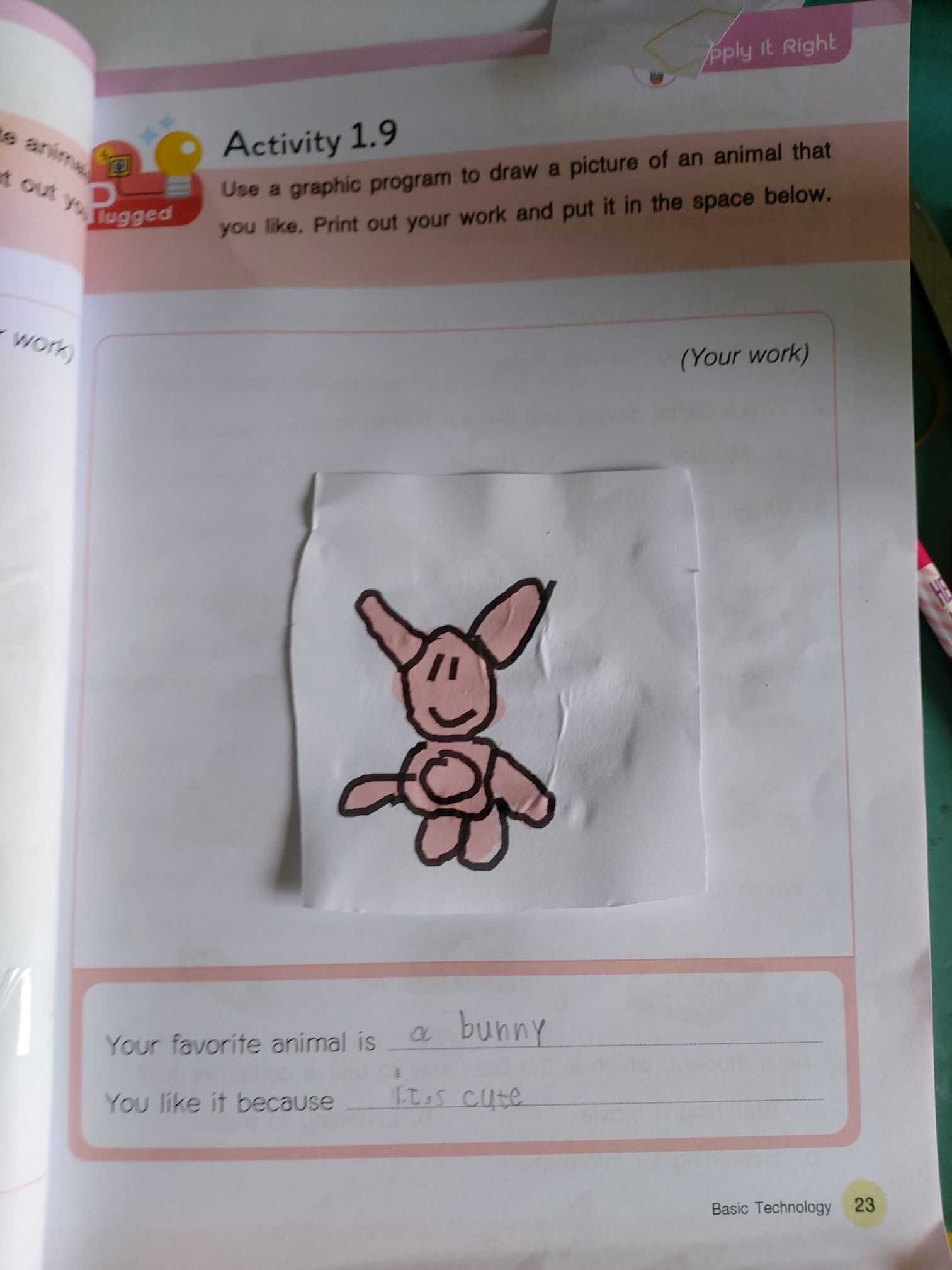- วิทยาการคอมพิวเตอร์: ทำโปรเจ็กต์สุดท้ายของหน่วยที่ 1 (วาดภาพด้วยสีเพื่อบันทึกไฟล์และพิมพ์) แล้วทำการทดสอบท้ายบทและด้วยผลลัพธ์ที่น่าพอใจ