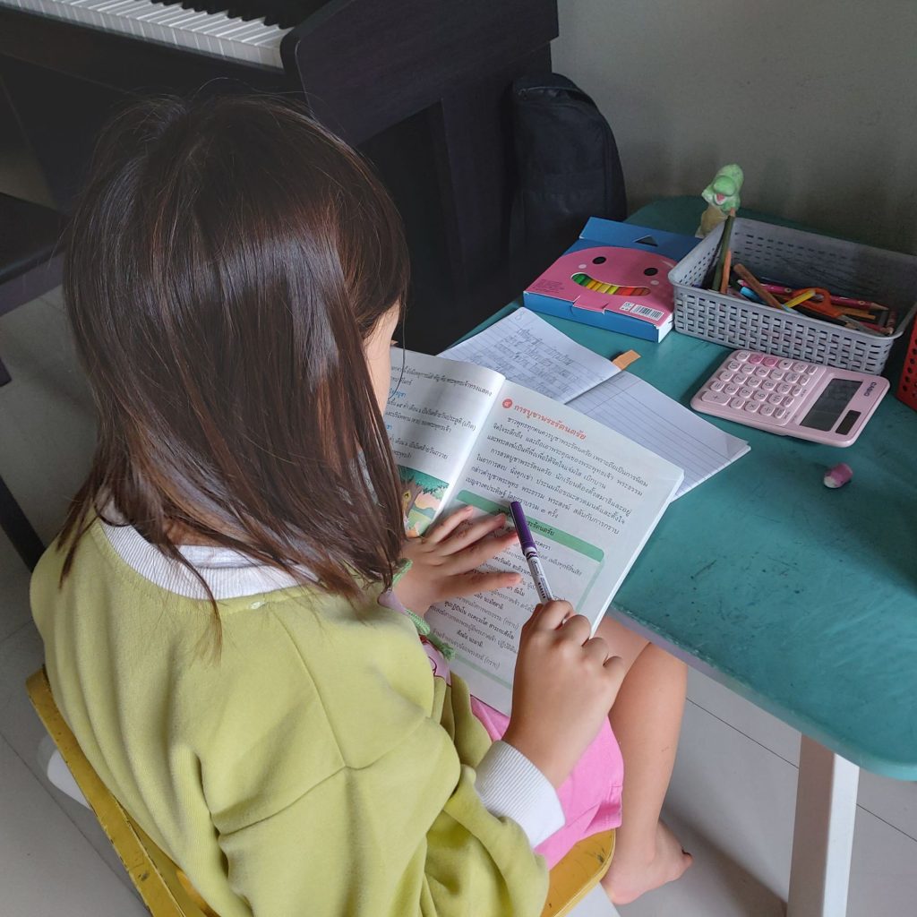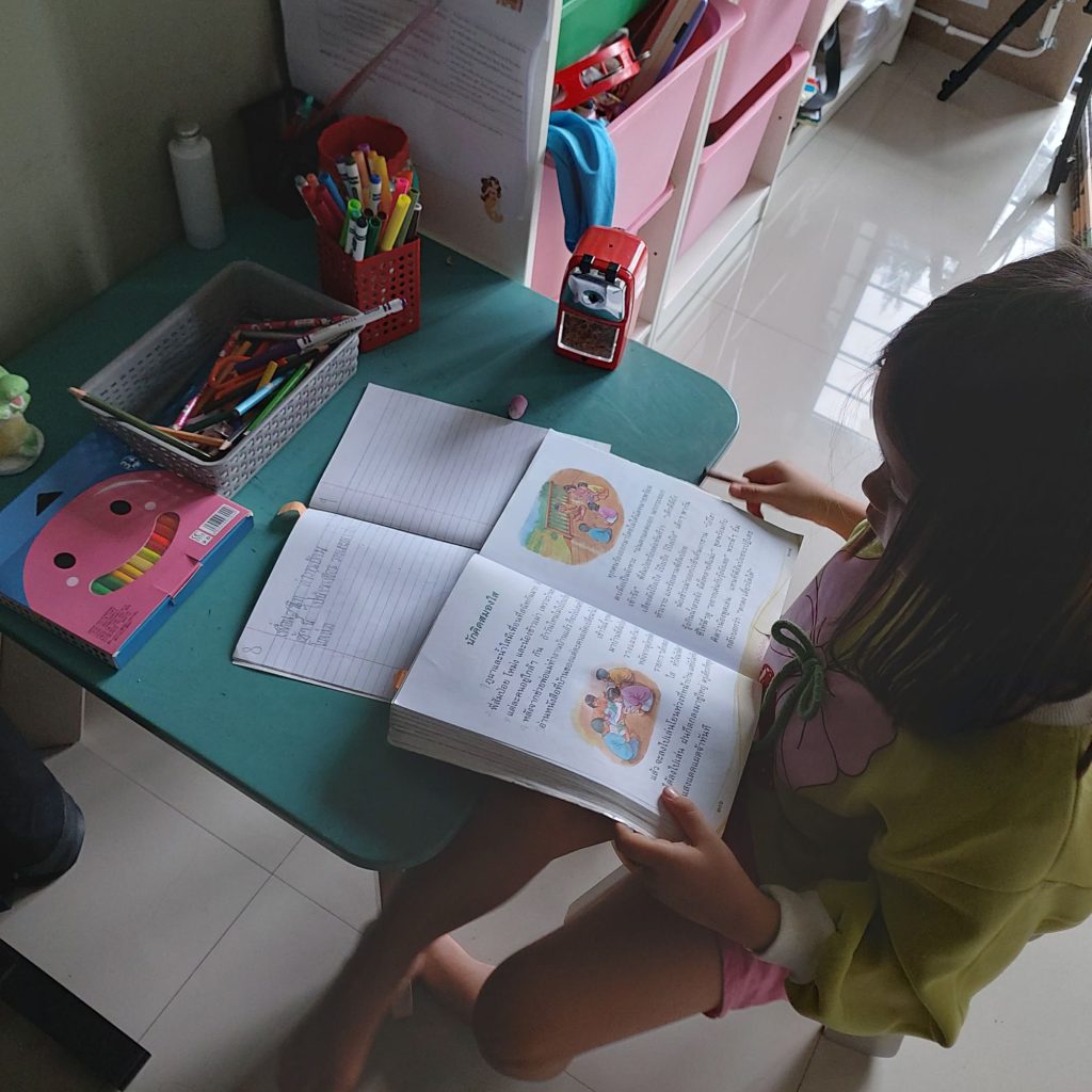 อ่านหนังสือเรียนสังคมศึกษา ศาสนาและวัฒนธรรม บทที่ 4 ชาวพุทธที่ดี และรับฟังการสอน/อธิบายเพิ่มเติมจากคุณแม่ ประกอบด้วย การบำเพ็ญประโยชน์ต่อวัด วันสำคัญทางศาสนา การบูชาพระรัยนตรัยร้องเพลงวันมาฆบูชา