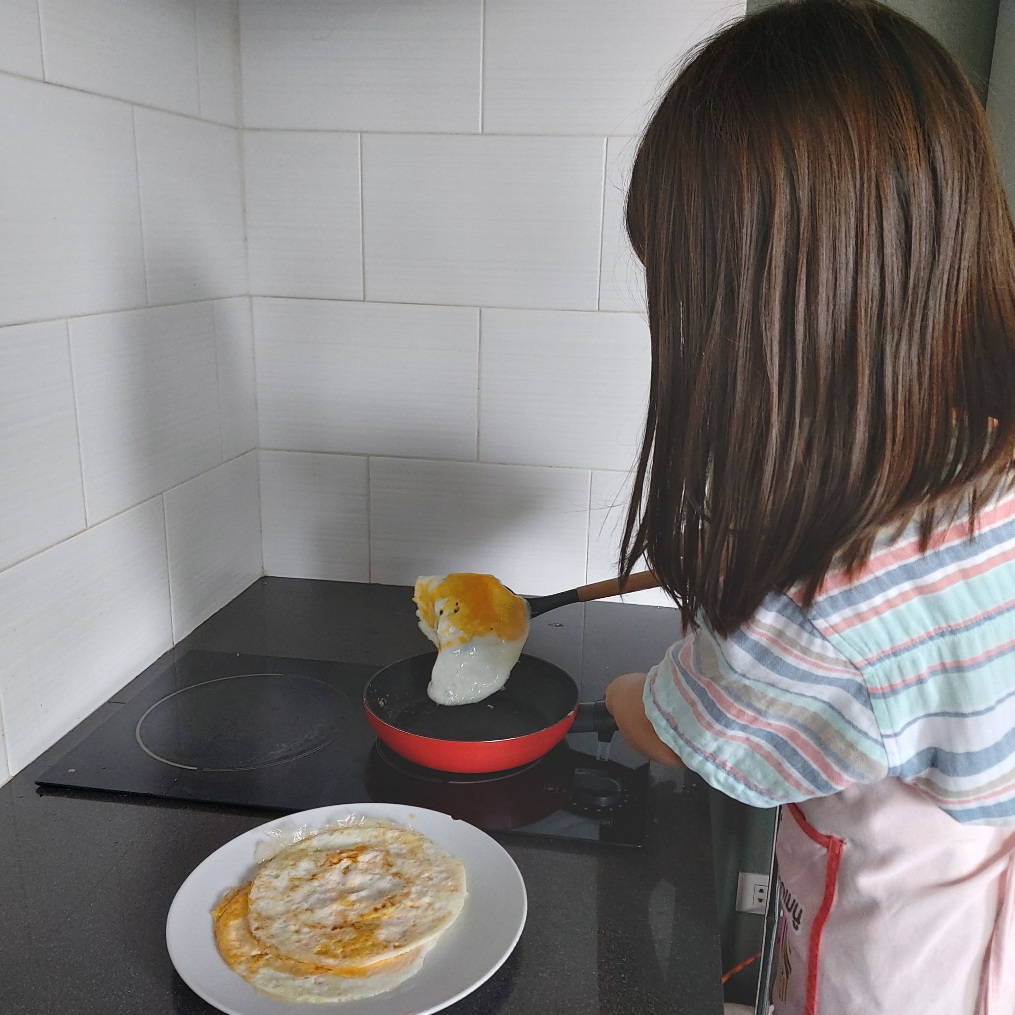 Cooked her own food for lunch. Some eggs for sandwiches.