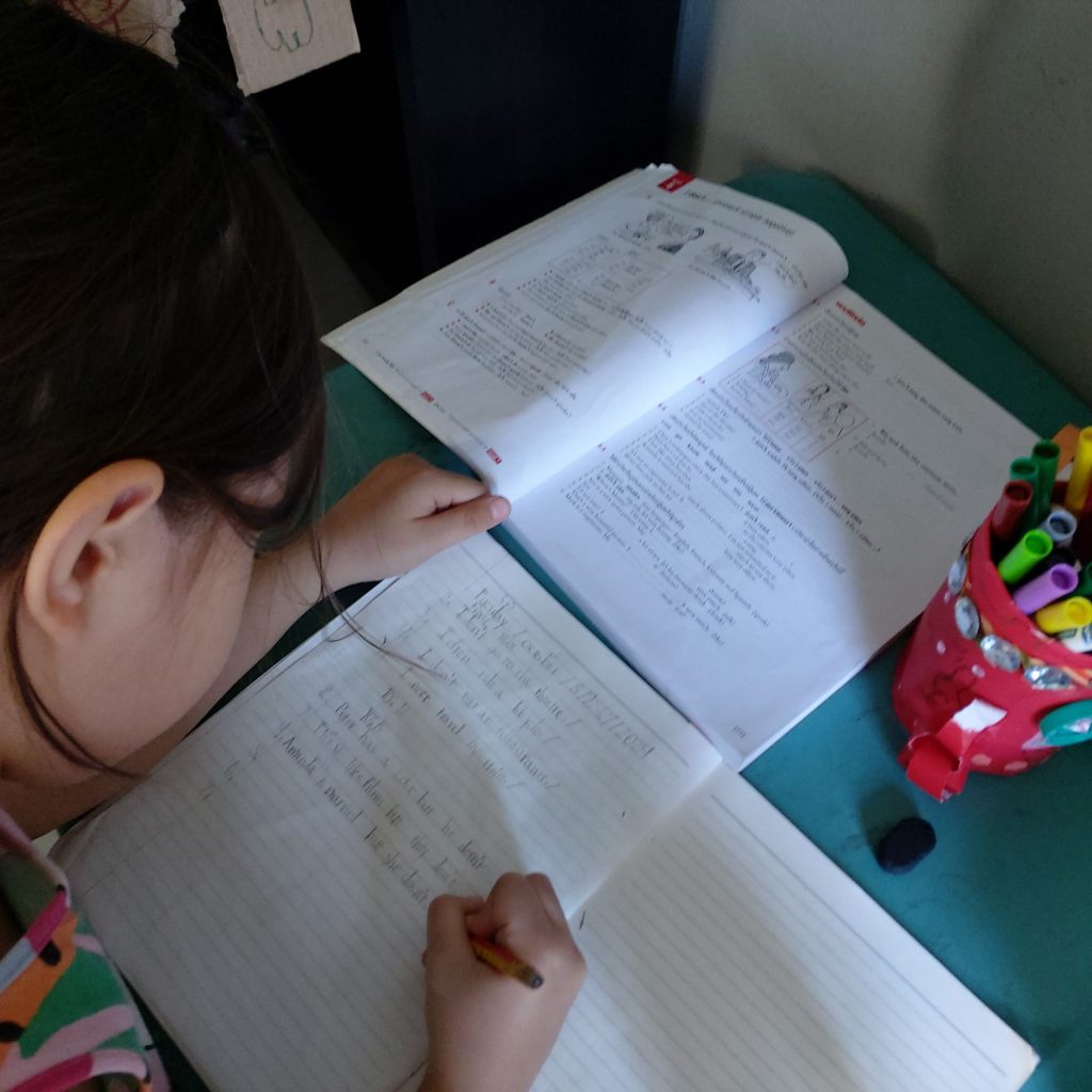 English: Present simple negative sentences in her grammar book with training exercises.