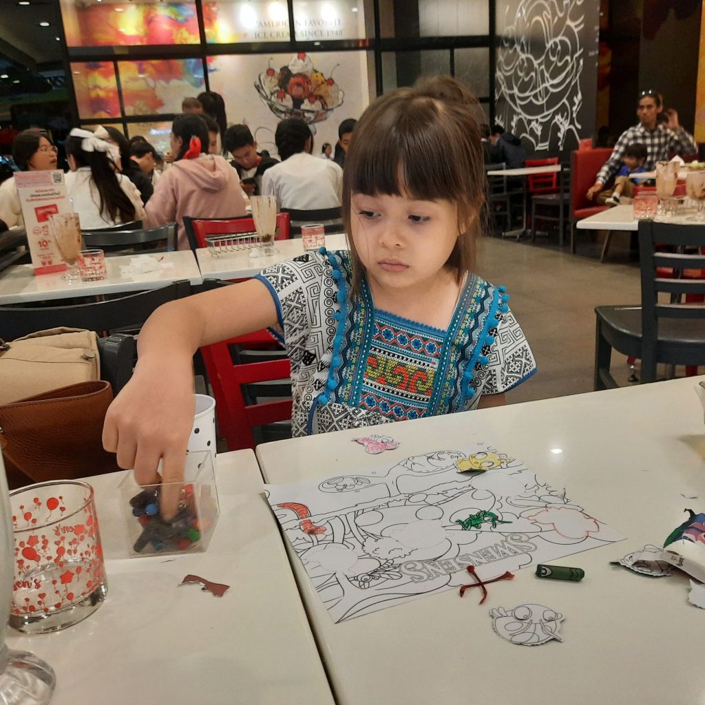 ช่วยแม่ป้อนอาหารน้องและพาน้องไปเดินเล่นที่เซ็นทรัล เฟสติวัลเชียงใหม่ รับประทานไอศกรีม ฝึกทักษะการอ่านเมนูอาหาร การเลือกรสที่ชอบ และสั่งไอศครีม เพิ่มพูนทักษะการรอคอยอย่างอดทน ได้วาดรูประบายสีระหว่างรอ