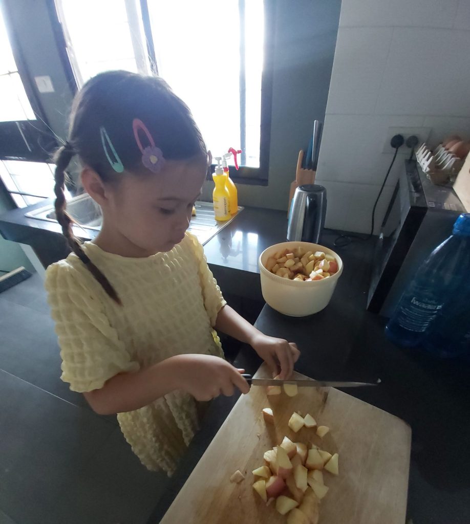 การงานฯ : ช่วยพ่อหั่นแอปเปิลเพื่อทำซอสแอปเปิลให้น้อง